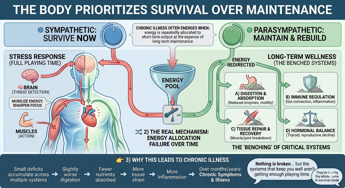 What you described — “systems getting benched” — is actually one of the most accurate, intuitive ways to understand what’s happening in the body under chronic stress.